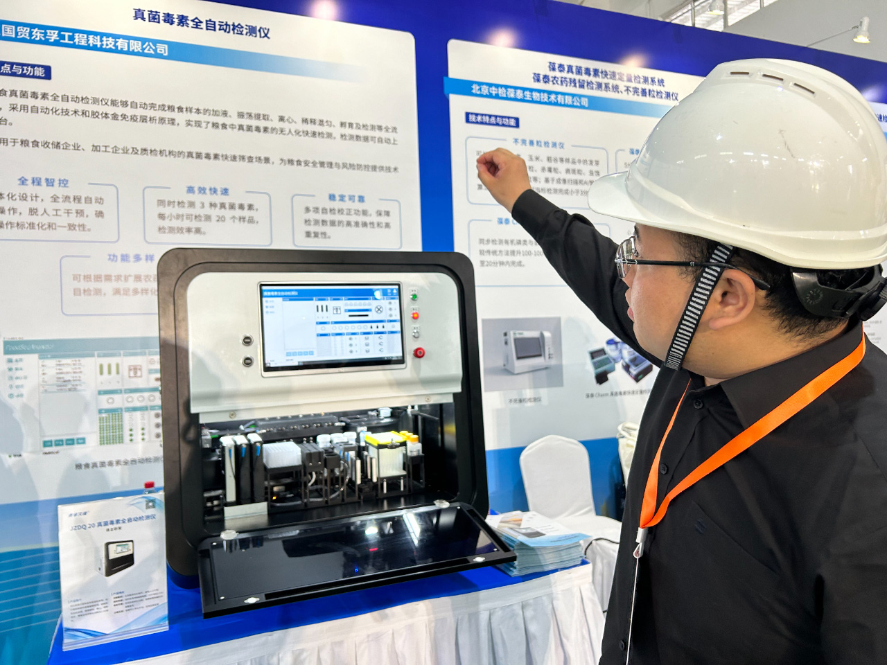 在糧食質(zhì)量安全檢驗(yàn)檢測(cè)方面,北京國(guó)貿(mào)東孚工程科技有限公司帶來了一款剛剛完成“全國(guó)首展”的真菌毒素全自動(dòng)檢測(cè)儀。該公司銷售部副主任姬翔表示:“這款儀器可以全自動(dòng)檢測(cè)小麥、稻谷、玉米、大豆等主要糧食油料作物中的6種真菌毒素。我們只需將稱量好的樣品放入儀器,即可自動(dòng)掃碼識(shí)別,按照設(shè)定的標(biāo)準(zhǔn)流程進(jìn)行樣品前處理和檢測(cè)的無人化操作,大大降低了人為干預(yù)風(fēng)險(xiǎn),檢測(cè)效率較人工提高2—3倍,每小時(shí)可批量檢測(cè)20個(gè)樣品,同時(shí)檢測(cè)多種毒素。”